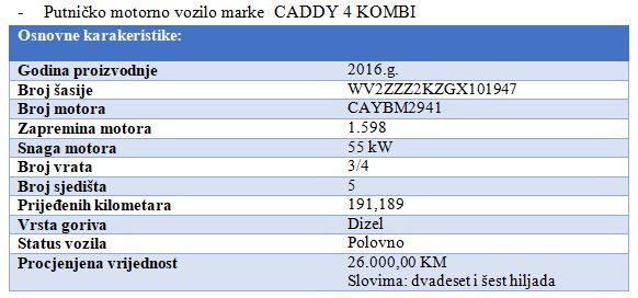 Predmet javnog poziva je prodaja putem javnog nadmetanja - licitacije službenog putničkog   motornog vozila sljedećih karakteristika: